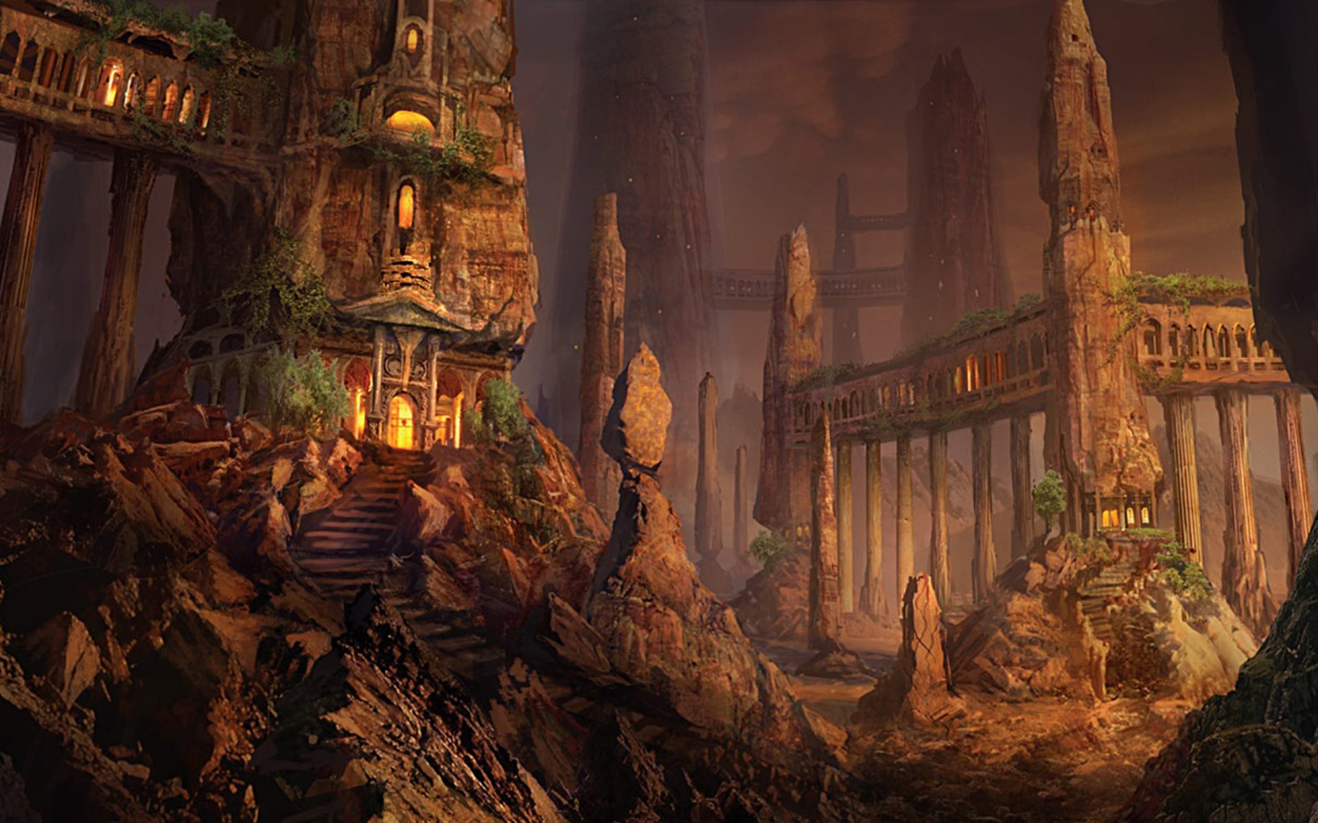 Wysokie budowle, zatoka oceanu i zieleń spowite mgłą nWysokie budowle, Zatoka oceanu i zieleń spowite mgłą N
