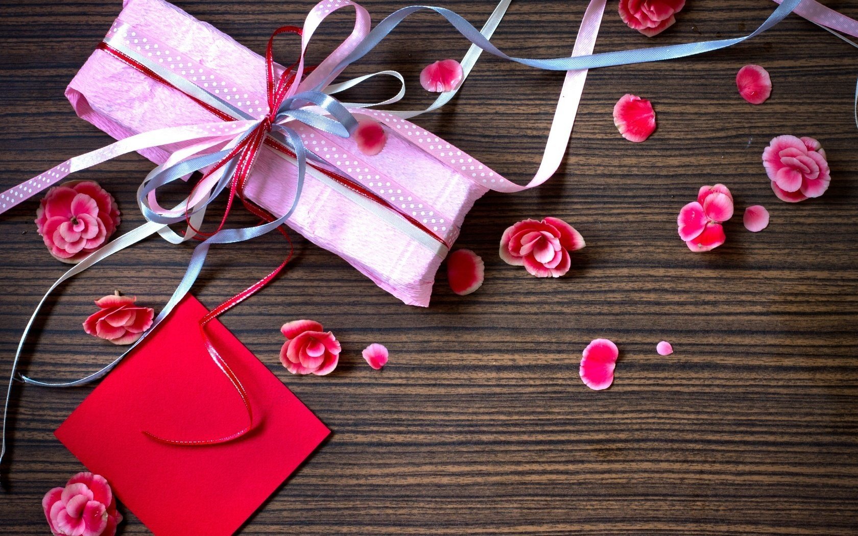 Zapakowany prezent na stole wśród kwiatów - tapety na pulpit
