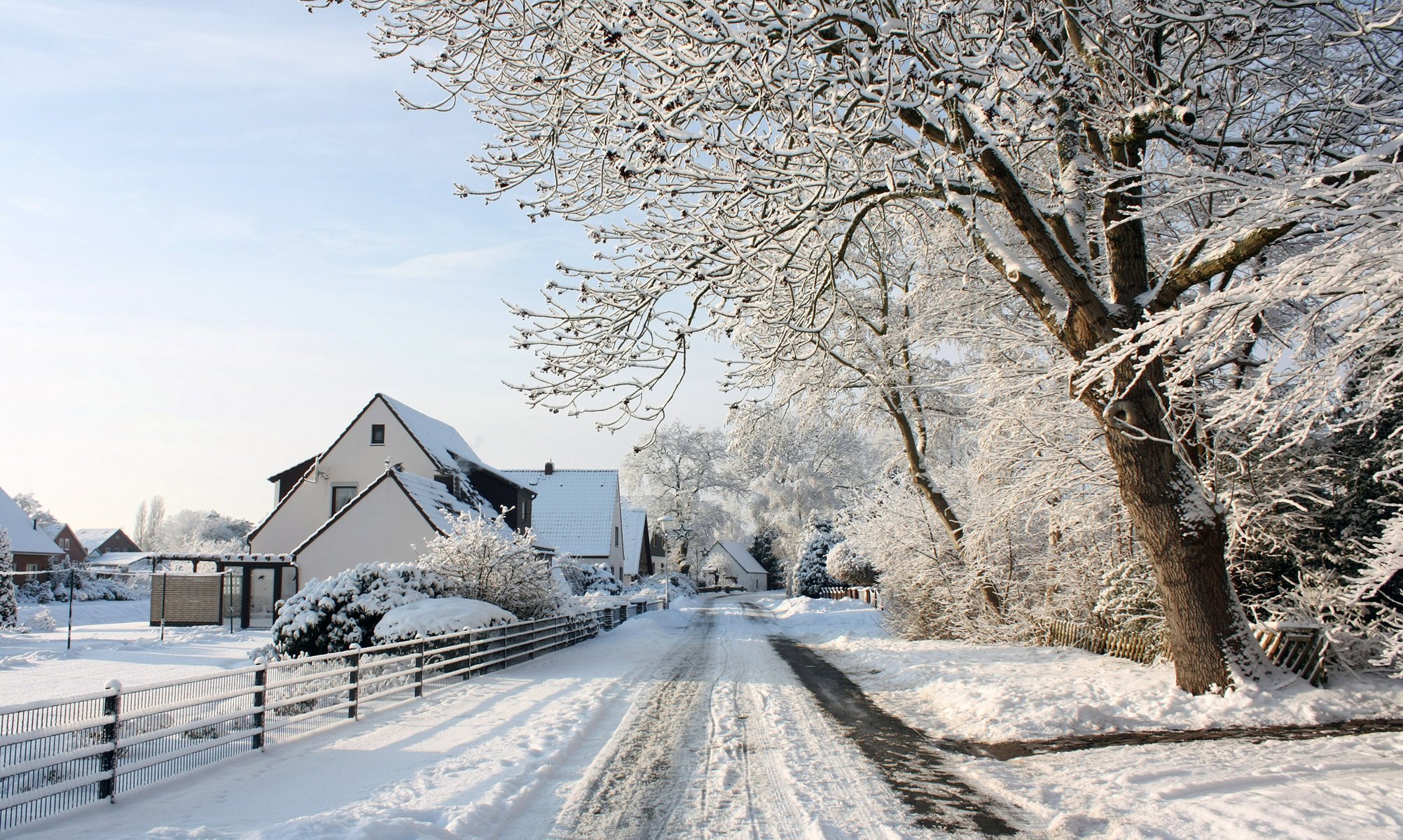 Zimowa droga w wiosce wzdłuż ogrodzenia - tapety na telefon