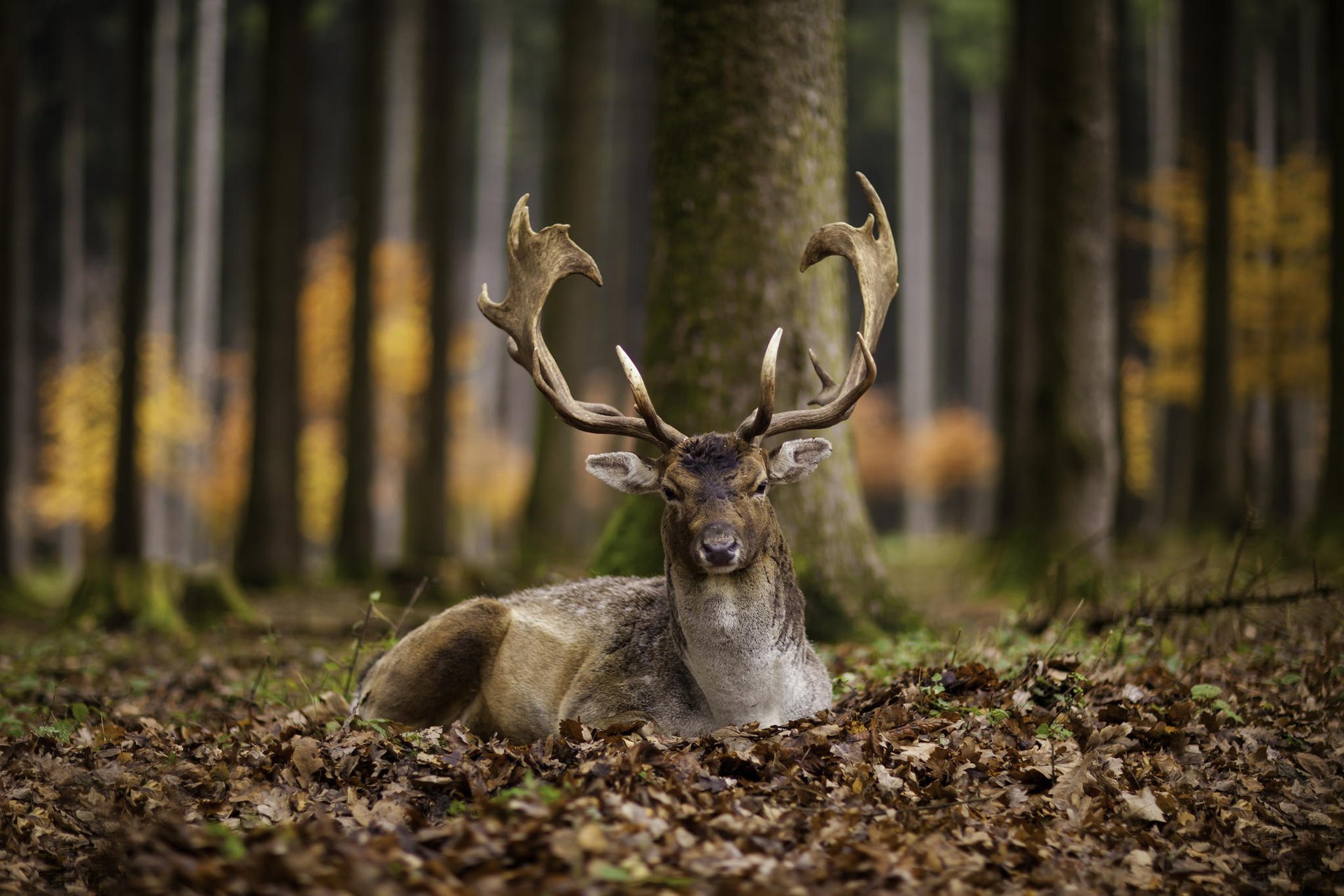 Jeleń rozłożył się na jesiennych liściach - tapety na telefon